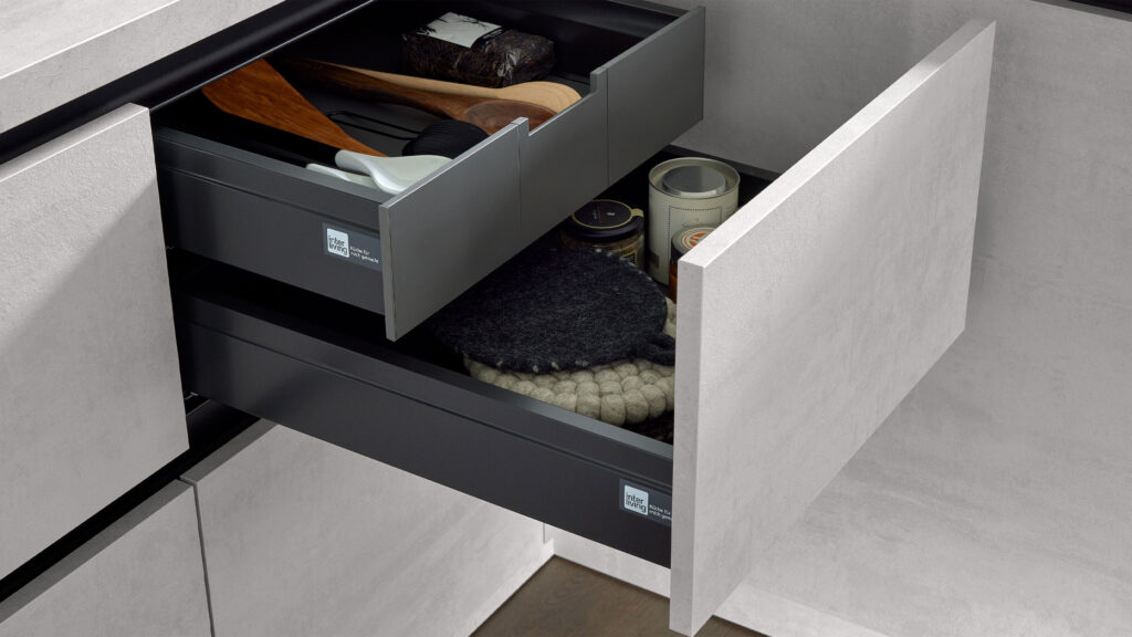 • Specials: Offene Abschlussregale, Auszüge mit Softeinzug, transparente Vitrinen mit Push-to-open