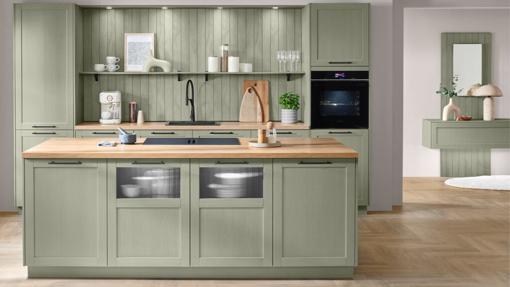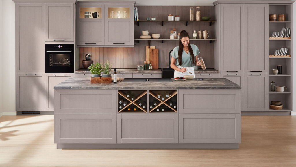 Die moderne Landhausküche wird 2026 von Nobilia noch einmal neu definiert: Mit neuen Farben und spannenden Gestaltungselementen wie Rahmenfronten, inszenierte Küchenregale und gesellige Kücheninseln. Modern Landhaus setzt sich zusammen aus der klassischen Rahmenfront, zarten Pastellfarben (Steinblau, Olive, Grau, …) und praktischen Wandboards, auf denen Küchenutensilien und Gewürze zur Schau gestellt werden.