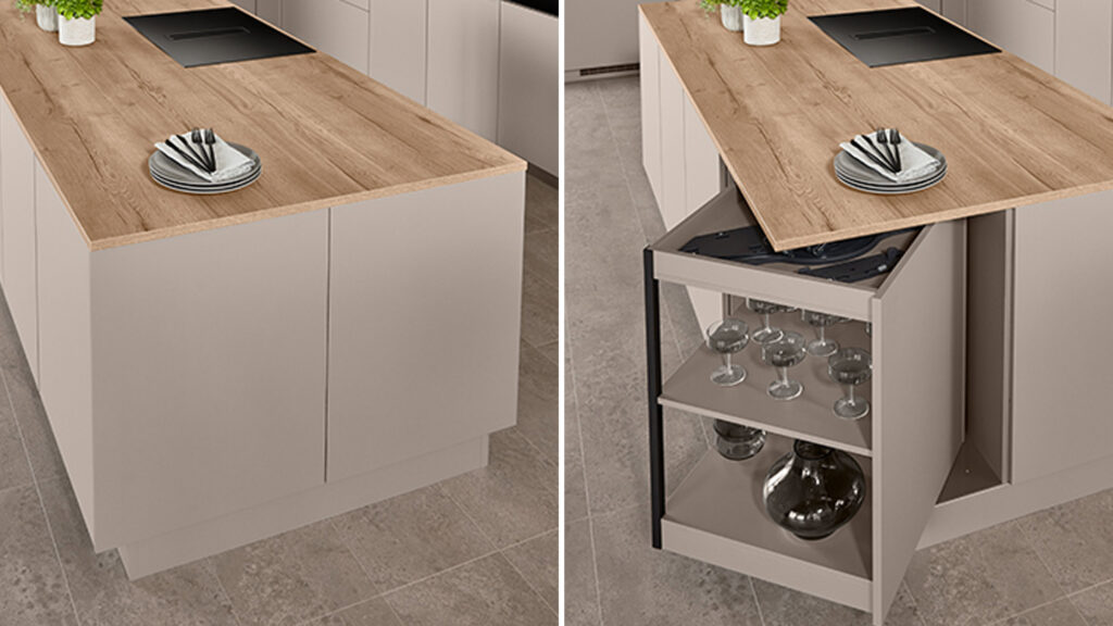 Absolutes Must Have für die Nobilia Küche 2026 ist aber der Drehschrank Furnspin, ein multifunktionales Element in der Kücheninsel, das sich um 360° drehen lässt.