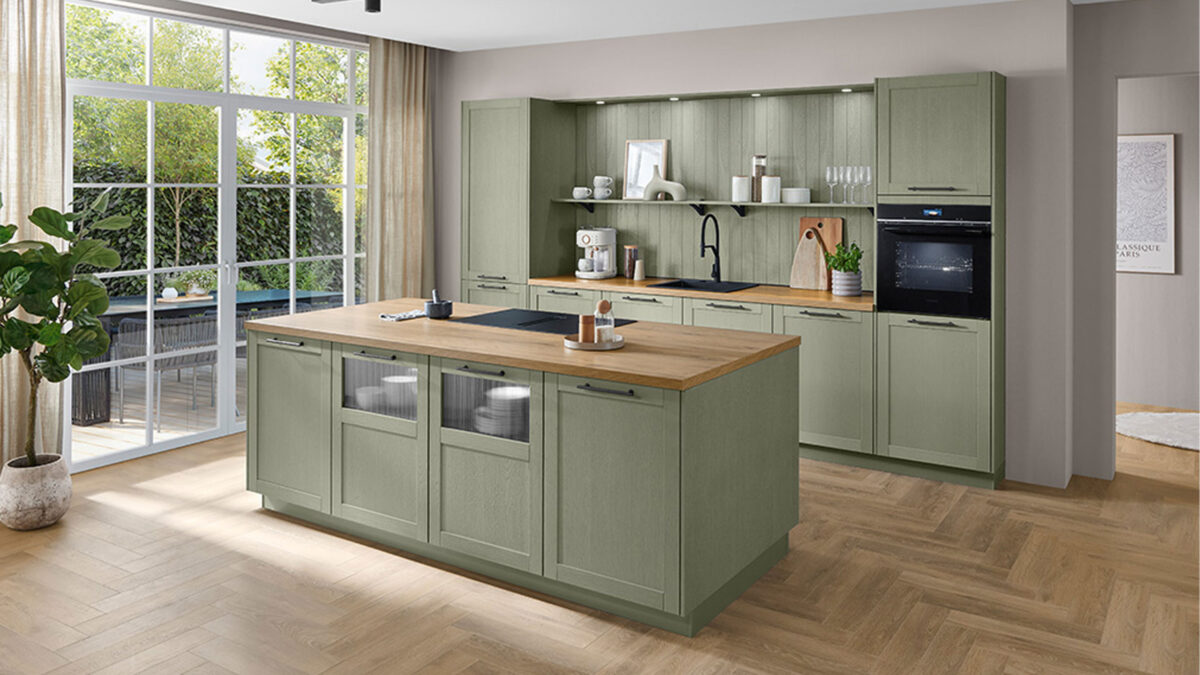 Die moderne Landhausküche wird 2026 von Nobilia noch einmal neu definiert: Mit neuen Farben und spannenden Gestaltungselementen wie Rahmenfronten, inszenierte Küchenregale und gesellige Kücheninseln. Modern Landhaus setzt sich zusammen aus der klassischen Rahmenfront, zarten Pastellfarben (Steinblau, Olive, Grau, …) und praktischen Wandboards, auf denen Küchenutensilien und Gewürze zur Schau gestellt werden.