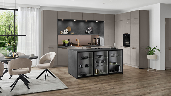 Absolutes Must Have für die Nobilia Küche 2026 ist aber der Drehschrank Furnspin, ein multifunktionales Element in der Kücheninsel, das sich um 360° drehen lässt.