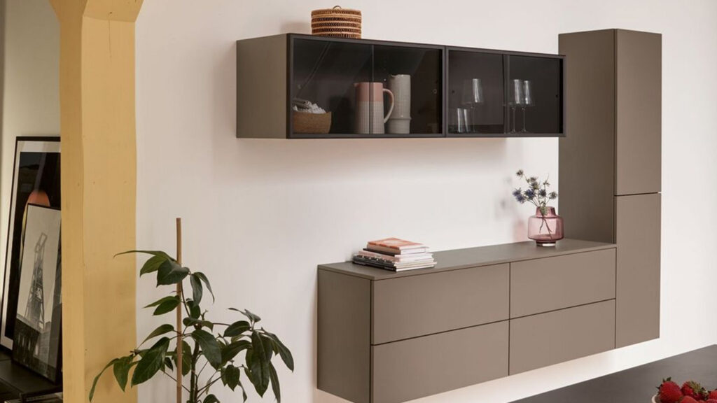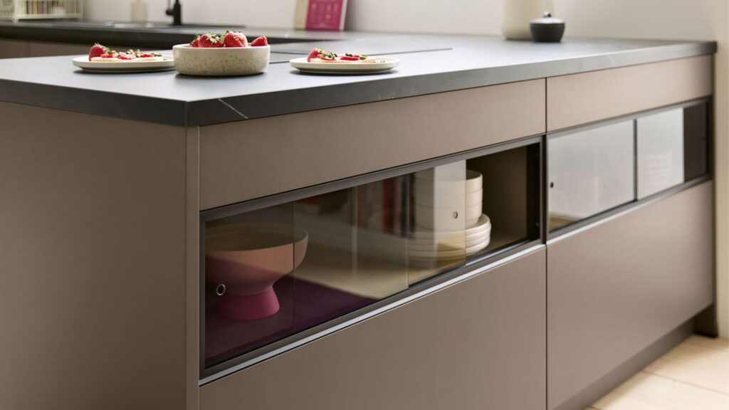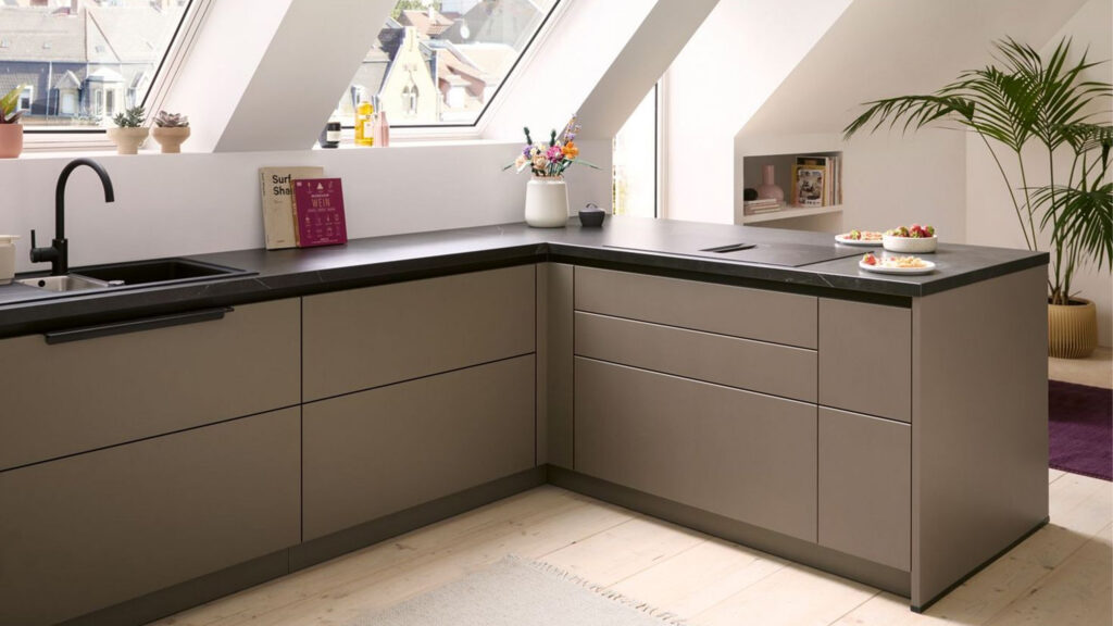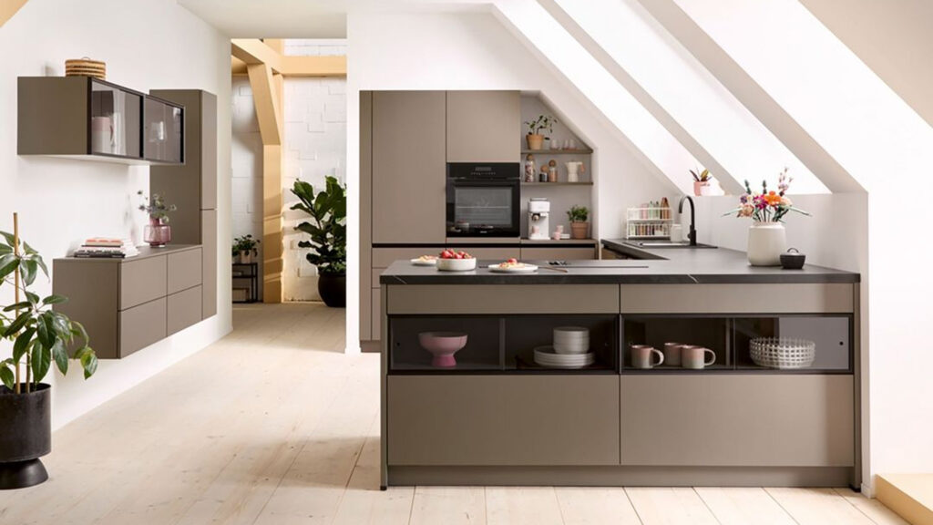 Unter den Schüller Neuheiten 2026 gibt es auch ein schönes Beispiel für eine Dachgeschoss Küche: Die Matera Colour. Ihre Highlights sind die Küchenregale mit Glasschiebetüren und wandhängende Küchenschränke für einen leichten Look.