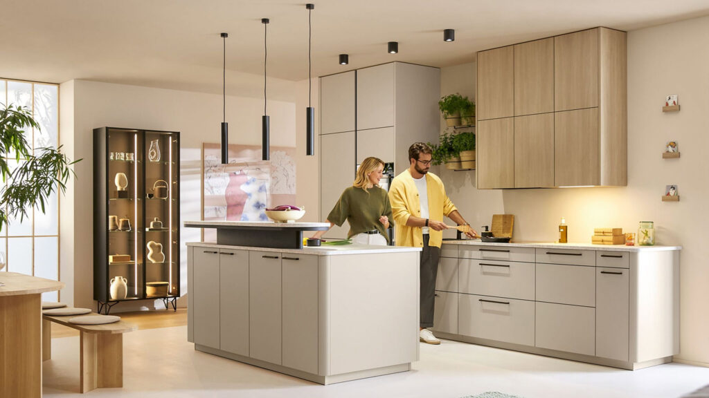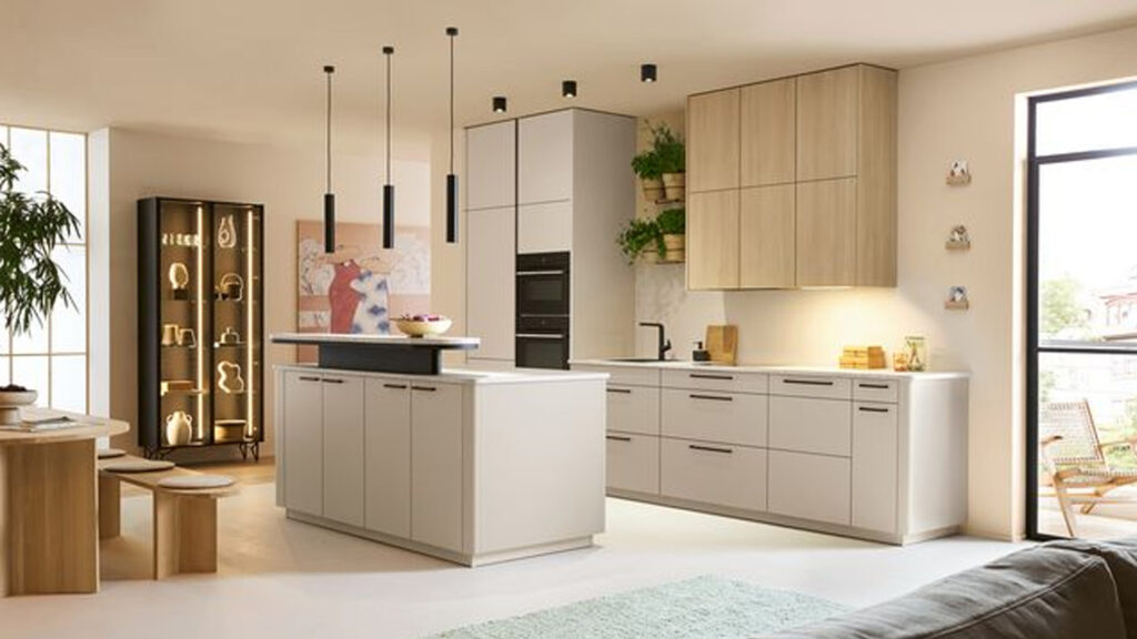 Salona von Schüller ist eine Designküche im Japandi Stil, ein Mix aus japanischem Minimalismus und skandinavischer Gemütlichkeit. Sie verbindet sanfte Formen (z.B. eine abgerundete Kücheninsel, runde Wangen, …) mit hellen Farben und praktischen Funktionen. Ihr Highlight ist das Barboard mit abgerundeten Kanten und einer integrierbaren Steckdosenleiste.