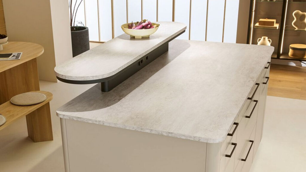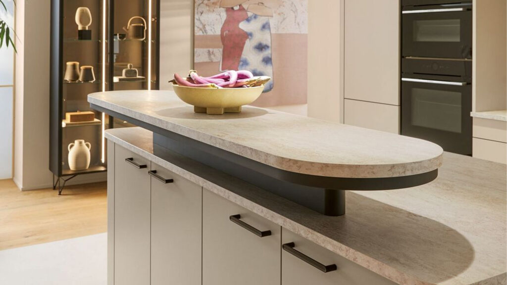 Ein neues Highlight bei Schüller 2026 ist die abgerundete Kücheninsel mit Barboard. Dadurch entsteht eine zweite Ebene mit zusätzlicher Arbeitsfläche. Die runden Formen sorgen für einen sanften und modernen Look.