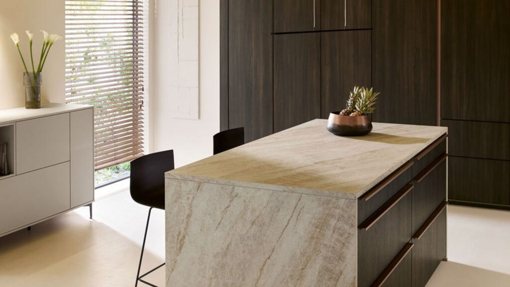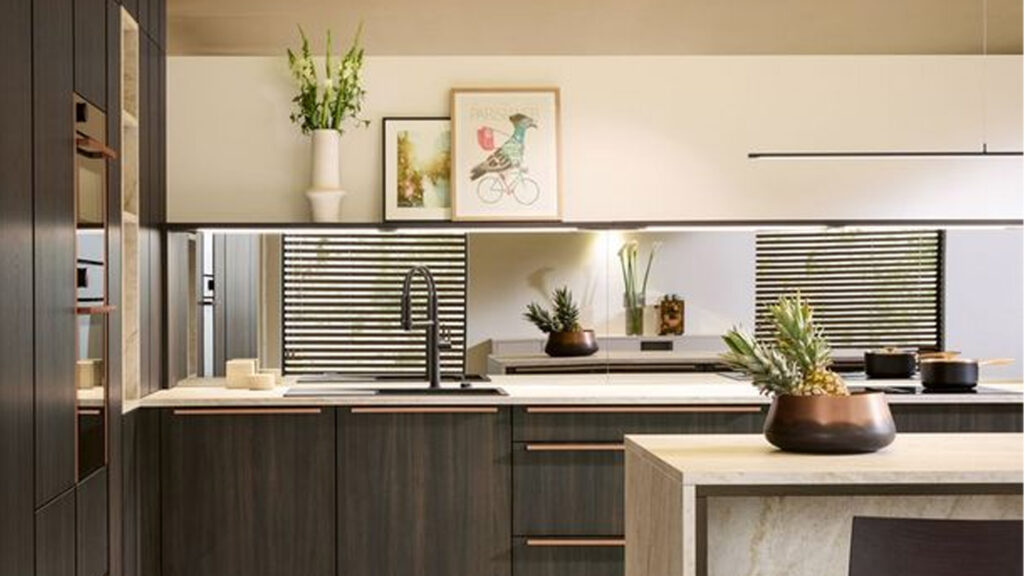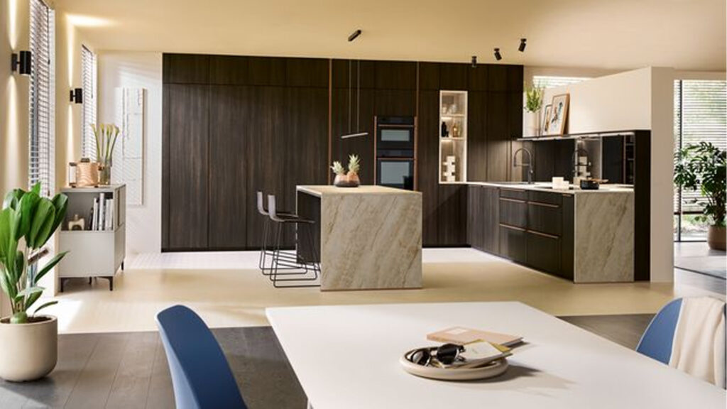 Dunkle, warme Farben kombiniert mit hellen Kontrasten, wie die Arbeitsplatte aus Taj Mahal Nachbildung – die Schüller Varese Küche ist ein elegantes Küchendesign mit durchdachten Details und hochwertigen Materialien. Das Highlight hier ist die Rückwand in Spiegelglas, die der Küche mehr Tiefe und besondere Eleganz verleiht.