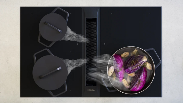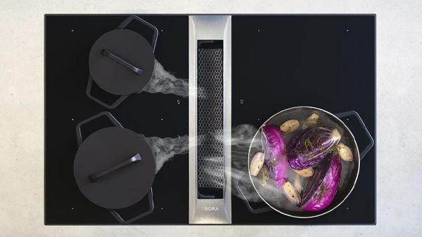 Beim dem neu aufgelegten Klassiker-Kochfeld von BORA handelt es sich um ein modernes Induktionskochfeld mit integriertem Dunstabzug in einem geschlossenen System, bei dem Kochfeld und Kochfeldabzug miteinander kommunizieren. Der rechteckige Dunstabzug befindet sich mittig im Kochfeld und öffnet sich elektrisch. Das bedeutet, sobald die Kochstelle eingeschaltet wird, öffnet sich die Klappe leise und automatisch. Hierüber werden Kochgerüche und –dünste direkt dort abgesaugt, wo sie entstehen. Am Kochfeld. Unterhalb sorgen dann integrierte Filter dafür, dass die Luft gefiltert und wieder abgegeben wird. Ist der Kochvorgang beendet, wird der Verschluß ebenfalls automatisch wieder geschlossen. Er verbindet sich völlig plan und ohne Fugenabstand mit der Kochfläche.