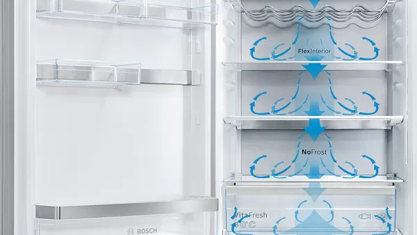 Bosch MultiAirFlow sorgt für eine gleichmäßige Kälteverteilung im ganzen Innenraum, damit Lebensmittel auch bei häufigem Öffnen der Tür optimal gekühlt werden. Über spezielle Luftkanäle und einen Ventilator wird die kühle Luft beständig und sanft im Bosch Kühlschrank verteilt, sodass auf allen Ebenen und in jeder Ecke eine konstante Temperatur herrscht.