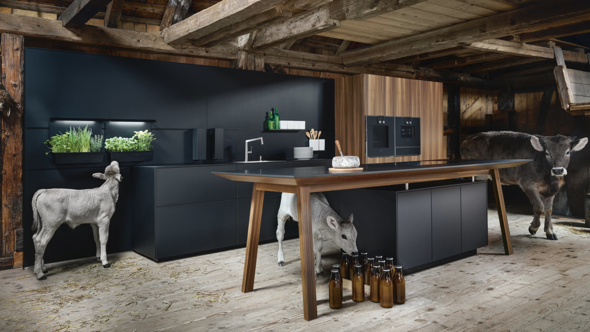 Schwarze Industrial Küchen liegen absolut im Trend. Häcker kombiniert die schwarze Küche im Industrie Look mit dunklen Holzelementen und langen Griffleisten aus Edelstahl (AV 8000).