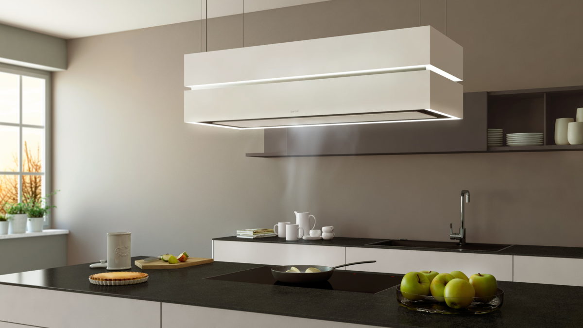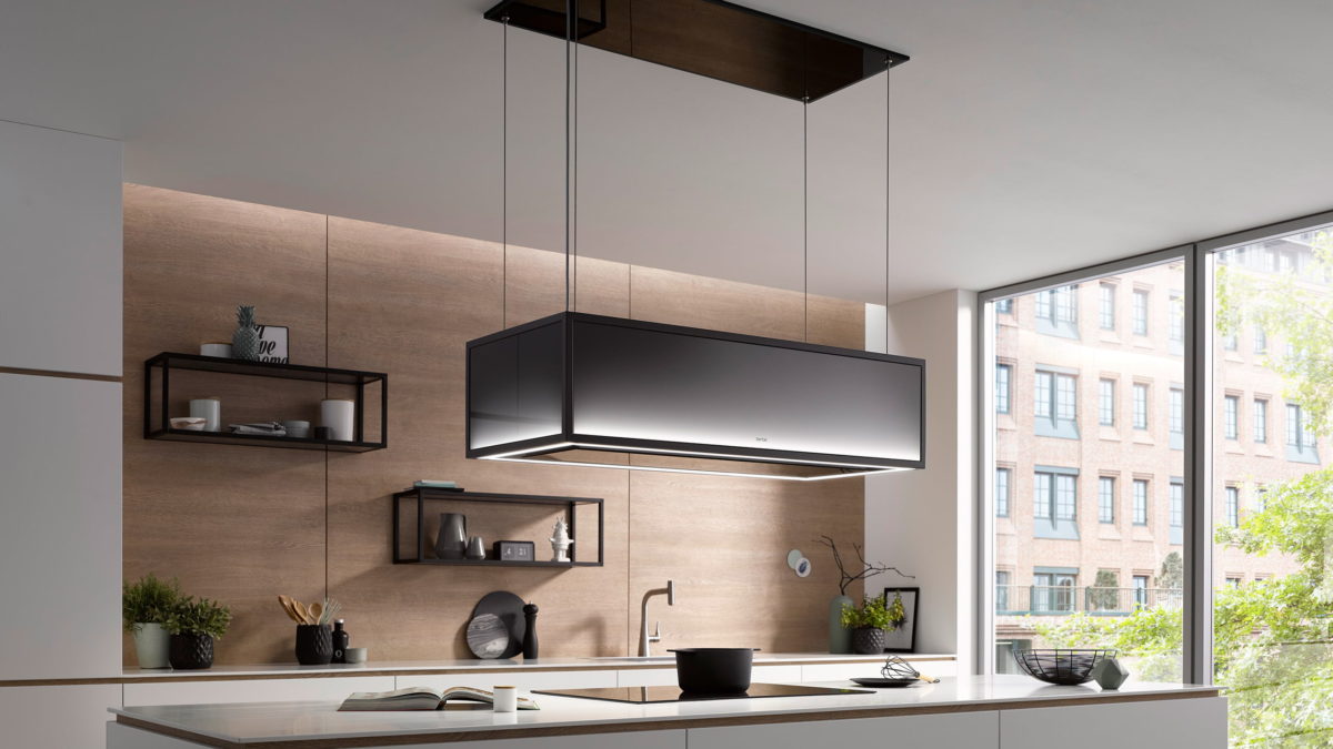 Deckenlift‑Hauben, die auf Knopfdruck (oder per Gestensteuerung) von der Decke schweben, Ambiente‑Lichtbänder und App‑Anbindung bieten. Mehrfach prämierte Ikonen des modernen Küchendesigns.Ergoline 2