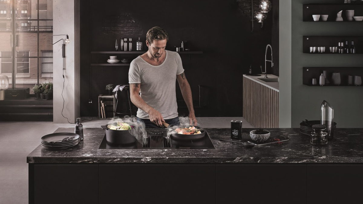 90 cm breites Induktionskochfeld mit zentraler Lüftereinheit und verschiebbarem Powermover. Red‑Dot‑„Best of the Best“ sowie Kitchen‑Innovation‑Award 2022; lässt sich mit permalyt® kombinieren.