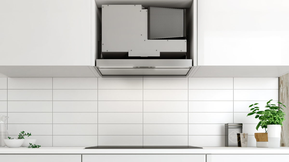 Sicherheitsglas in Schwarz oder Weiß vereint mit versteckter Bedienleiste; BackFlow gewährleistet volle Dunsterfassung, selbst bei vorderen Kochzonen.Downline Infinity